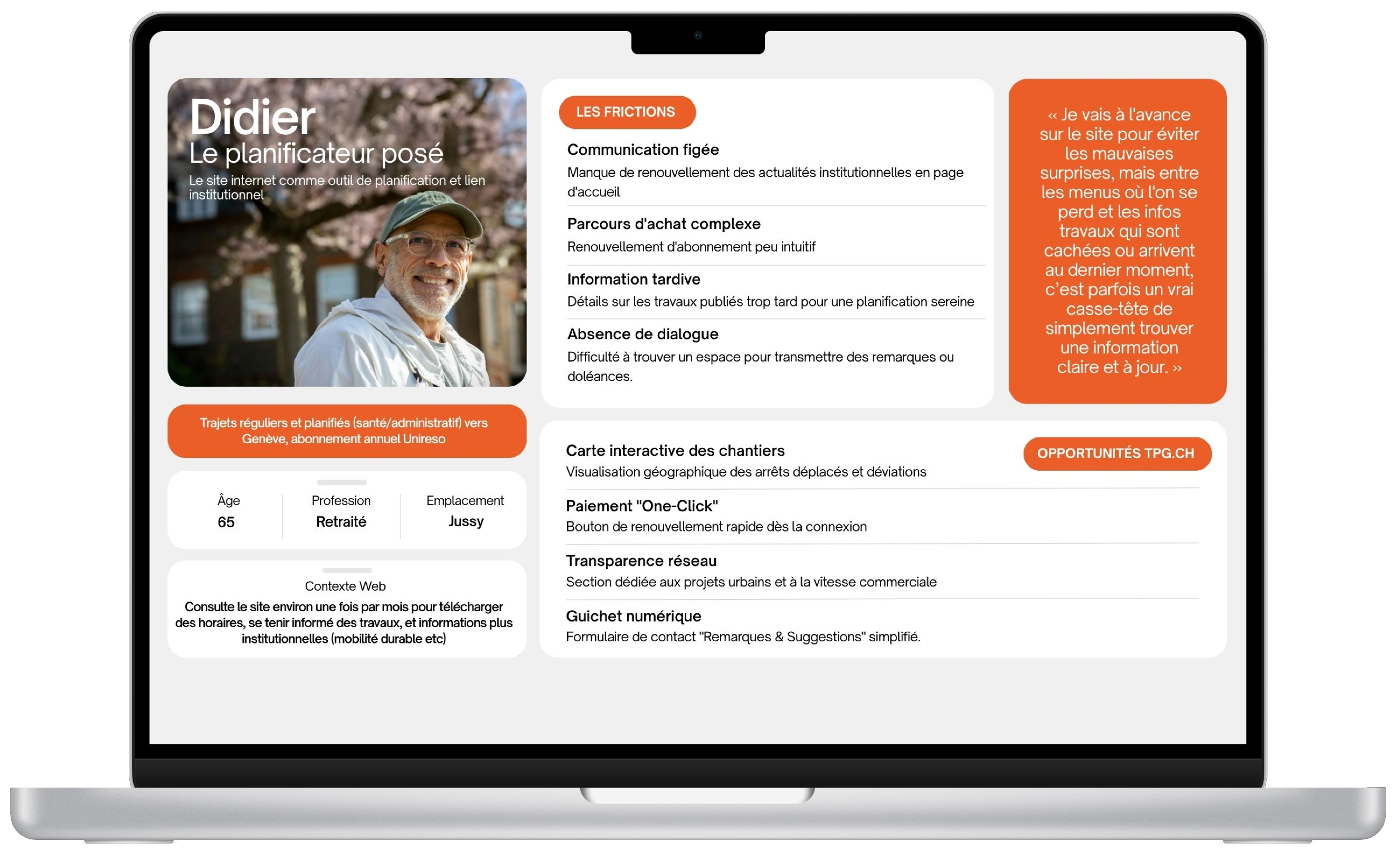 tpg used this work to redesign tpg.ch based on real digital journeys rather than average users.The personas helped prioritize homepage content, structure core sections, and adapt the experience to different levels of urgency, frequency, and digital confidence.
